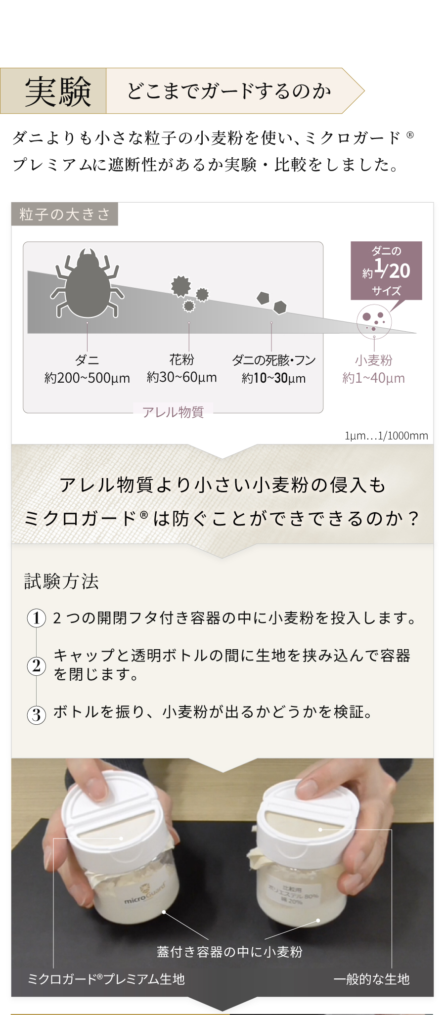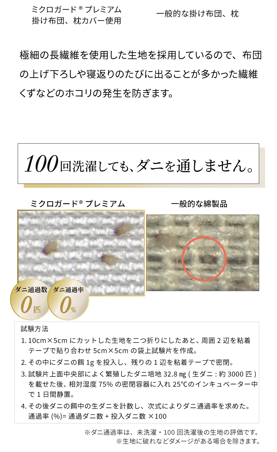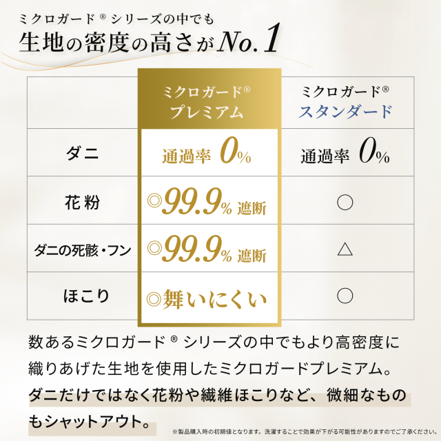 「ミクロガードⓇ プレミアム」生地は極細ポリエステル長繊維を高密度に織ることで物理的にダニの侵入を防ぐだけでなく、寝室のホコリの主要因である布団(生地と中わた)そのものからのホコリの発生も防ぎます。