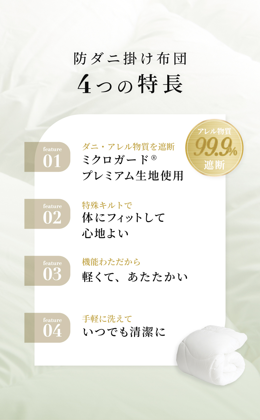 ダニやハウスダストなどのアレル物質対策にぴったりの安心で快適・清潔設計の掛け布団です。