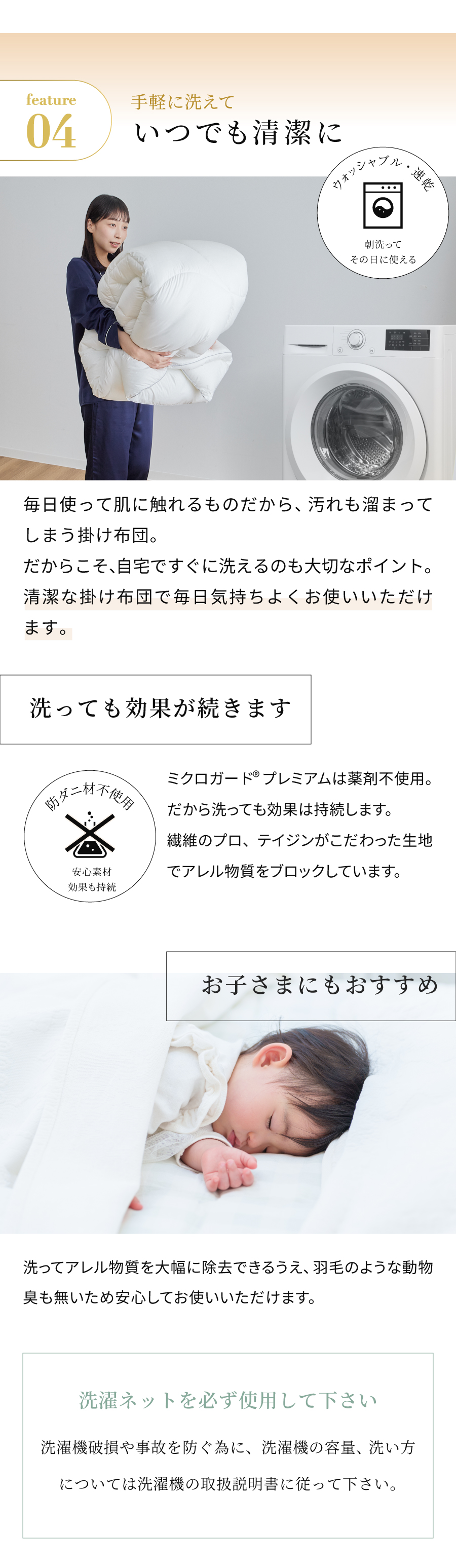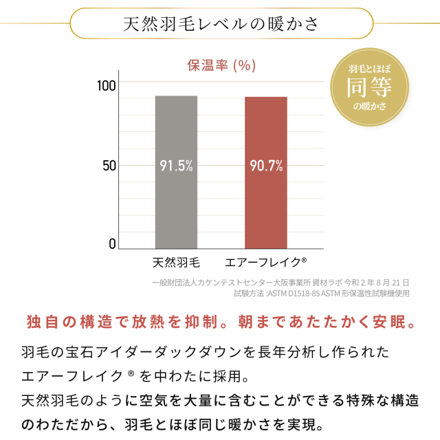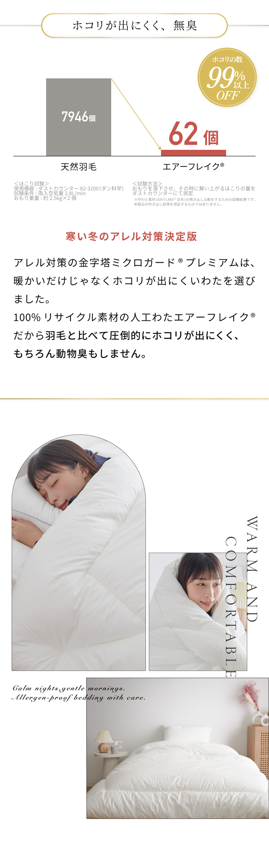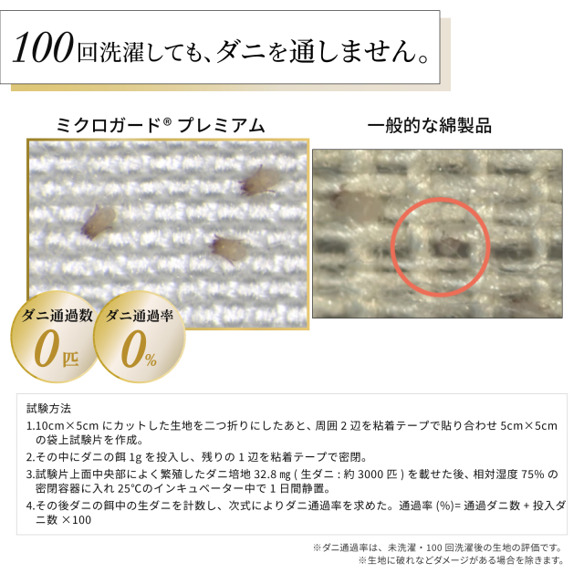 防ダニ剤不使用、防ダニ生地「ミクロガードⓇプレミアム」を側地に、中わたはクラボウ エアーフレイクを使用。
