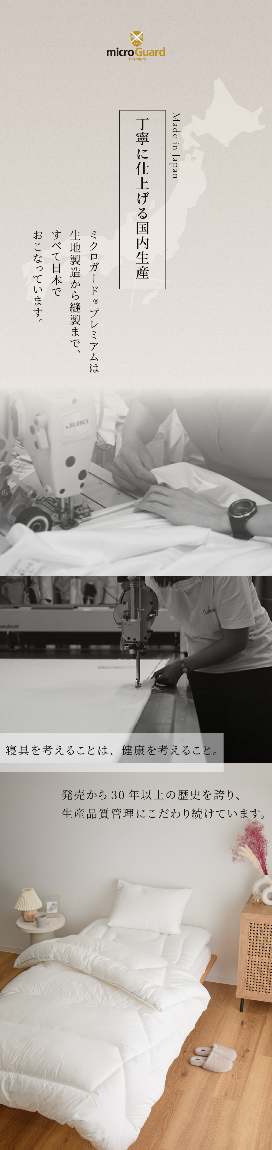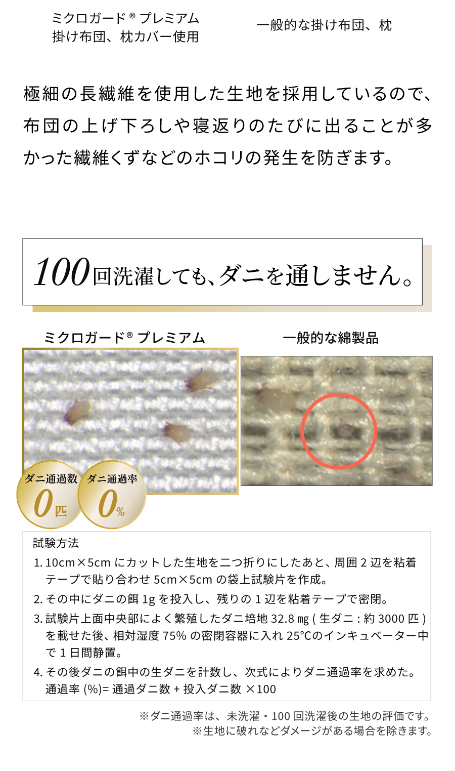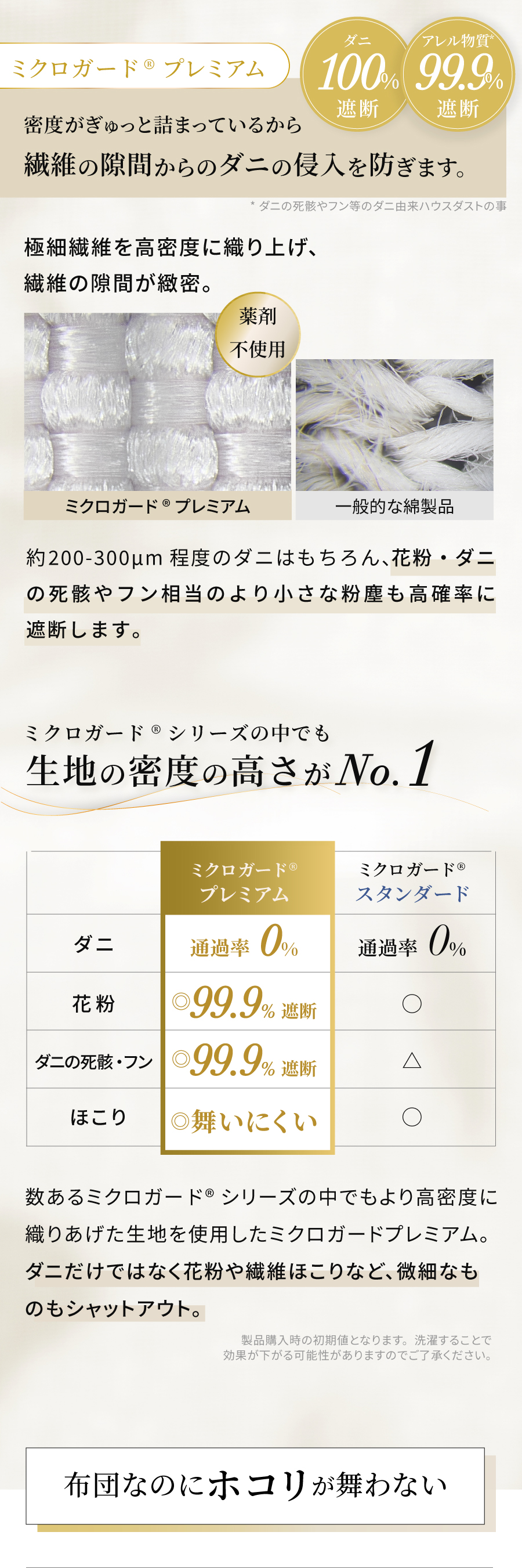 「ミクロガードⓇプレミアム」生地は極細ポリエステル長繊維を高密度に織ることで物理的にダニの侵入を防ぐだけでなく、寝室のホコリの主要因である布団(生地と中わた)そのものからのホコリの発生も防ぎます。