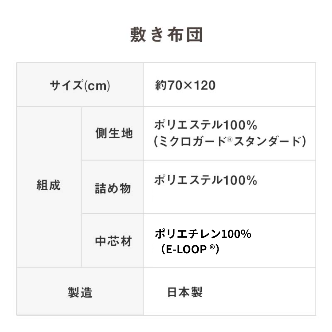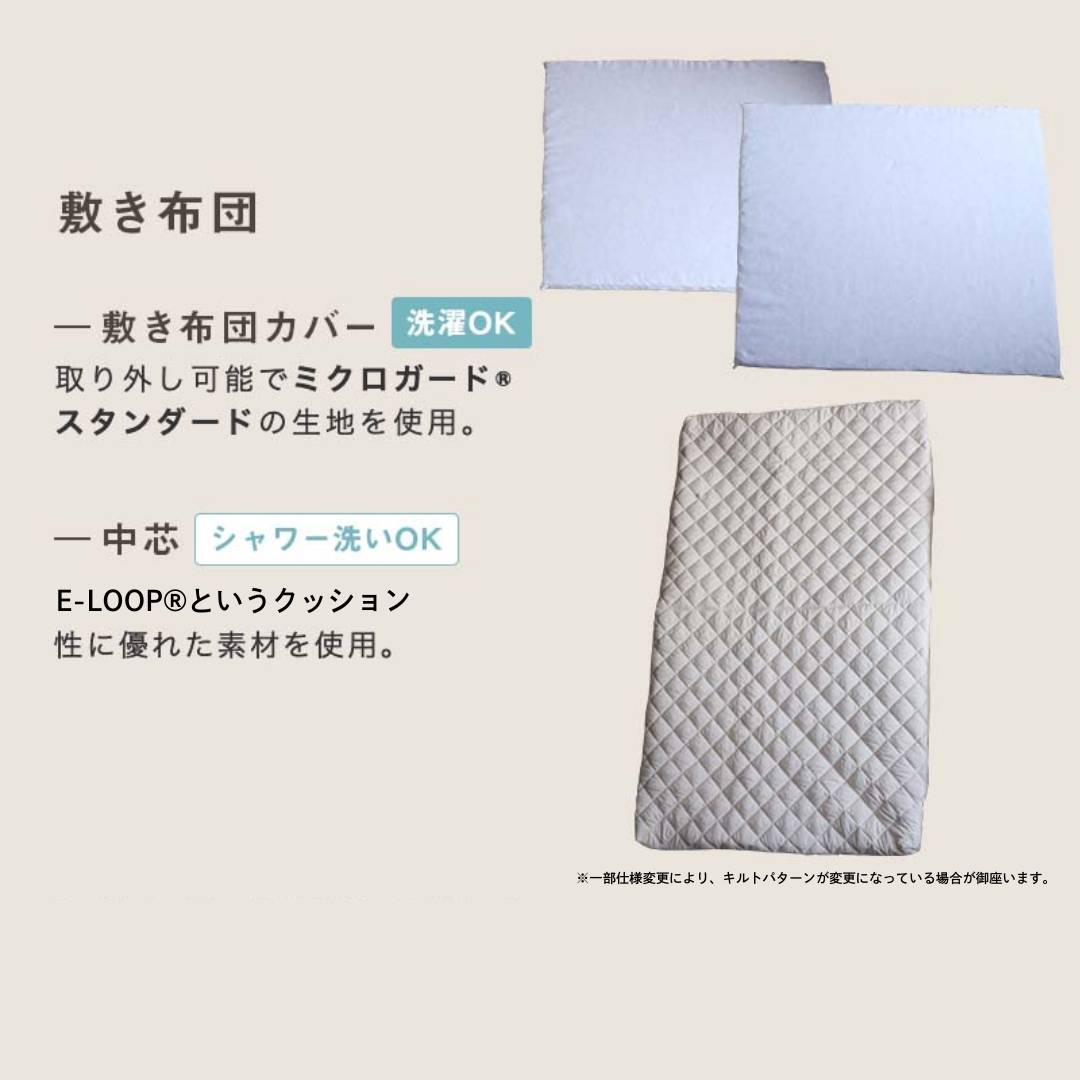 敷布団:掛け布団同様に「ミクロガードⓇ スタンダード」を側地に使用し、中芯材には、通気性に優れ適度な硬さの「E-LOOPⓇ 」を使用し、簡単に水洗いが出来る仕様です。