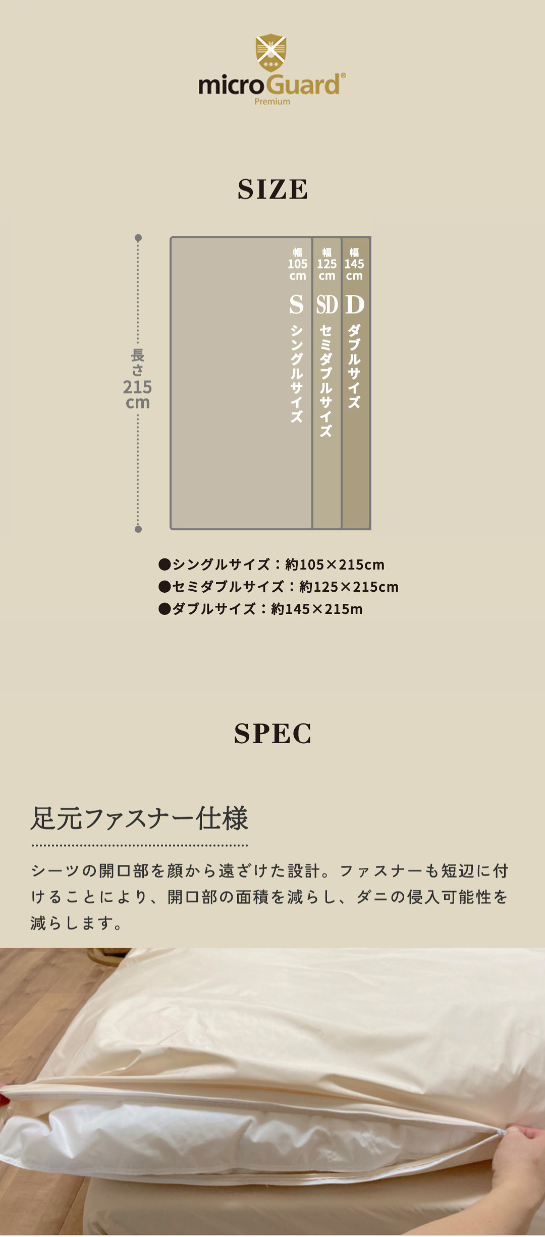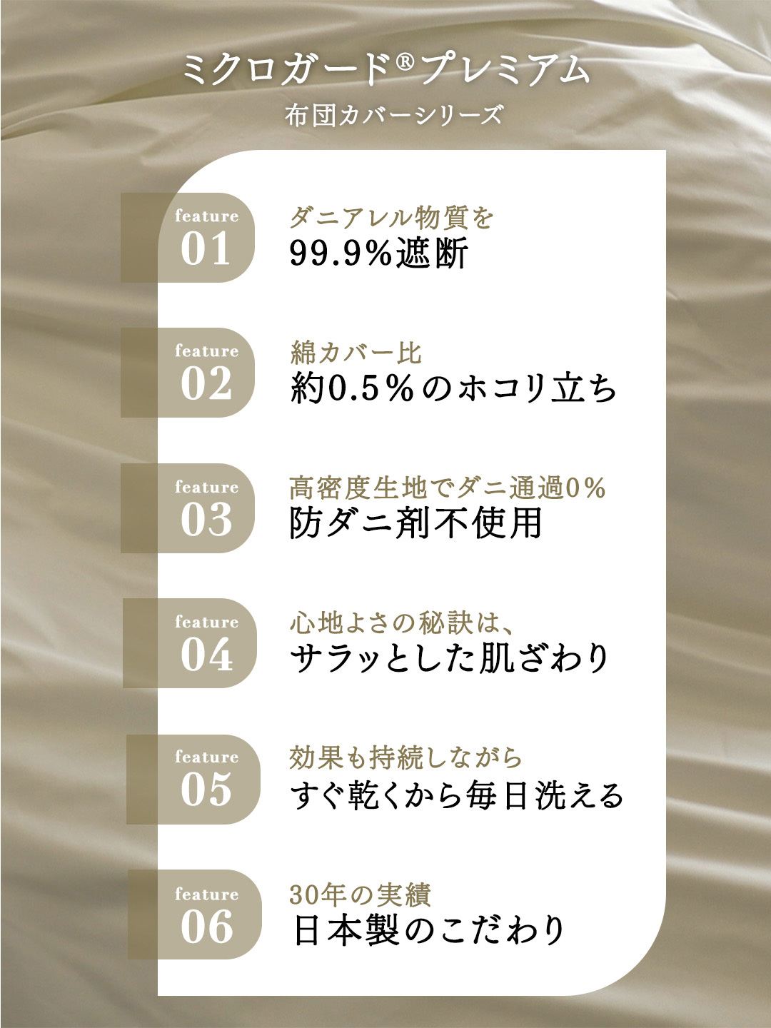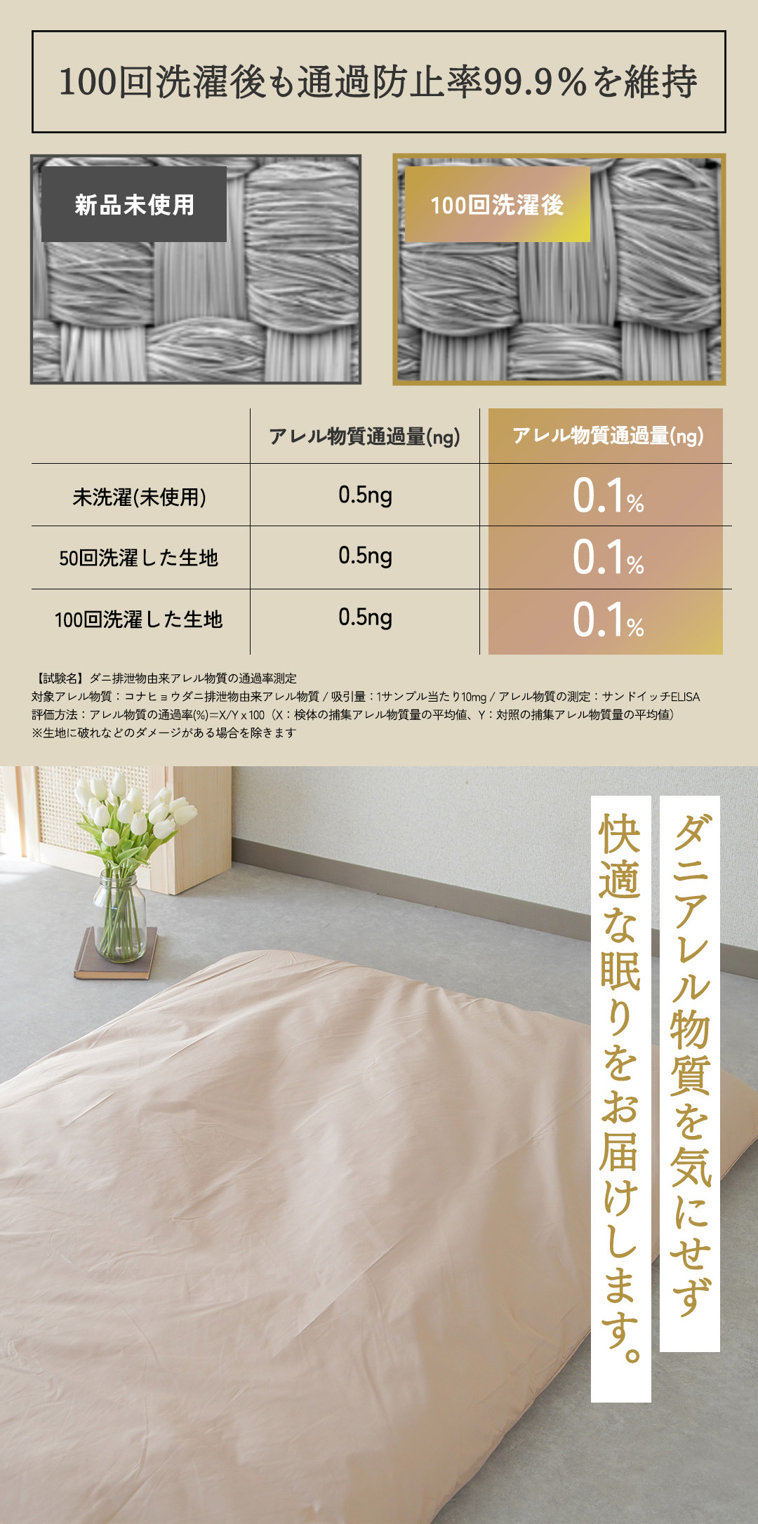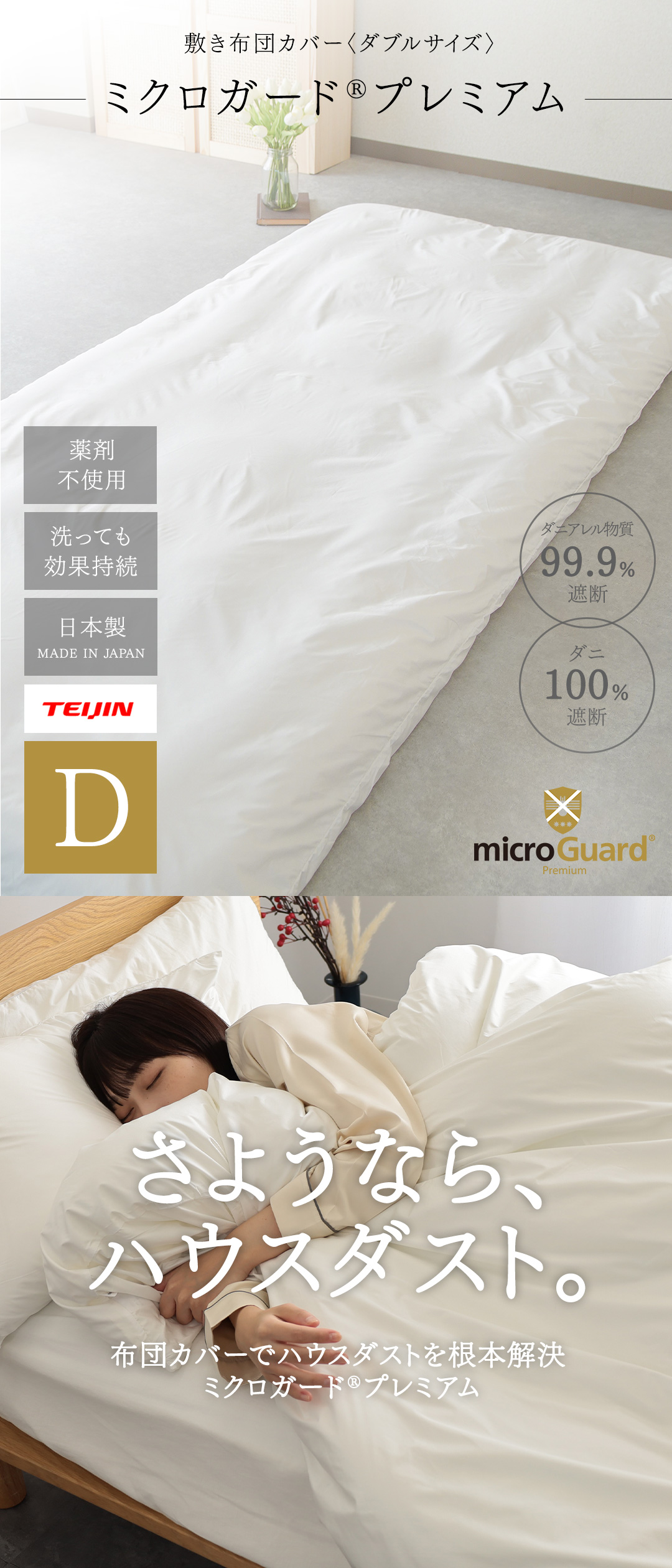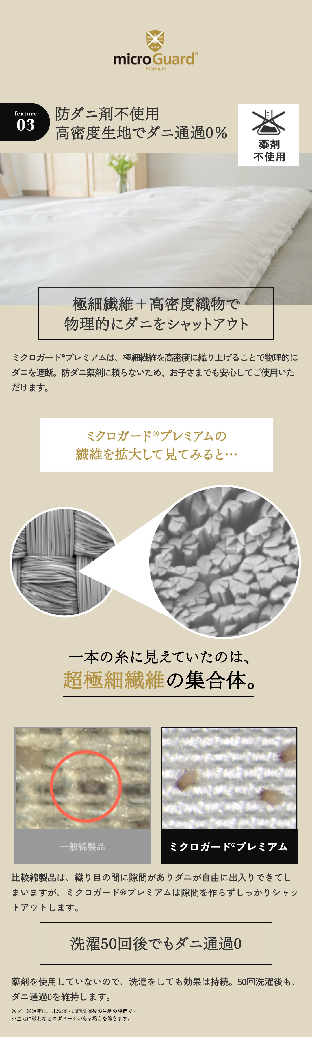 ミクロガードⓇは、生地特性上、また梱包の段階で細かい皺が入る事がありますが、防ダニ機能には影響ございません。